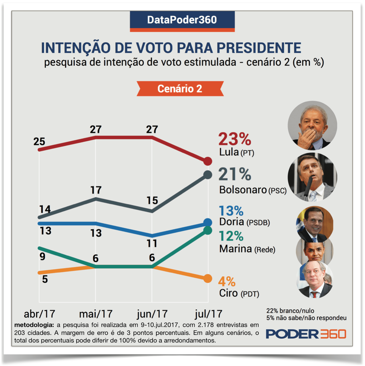 A pesquisa DataPoder360 foi realizada nos dias 9 e 10 de julho de 2017. Foram entrevistadas 2.178 pessoas com 16 anos de idade ou mais, em 203 municípios. A margem de erro é de 3 pontos percentuais para mais ou para menos.